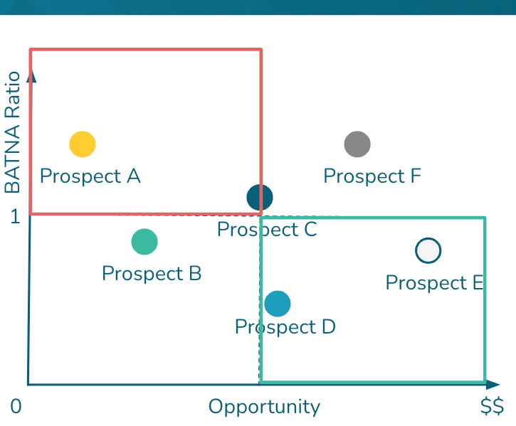 The lower right quadrant is most important; These are prospects who have a low BATNA ratio with a large opportunity size. These should be the first targets we prioritize. We then move systematically across this plot to determine our target order.