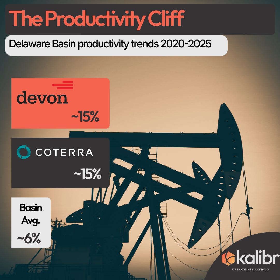 Jefferies published research in January 2026 quantifying what everyone in the Delaware Basin already understood intuitively. Basin-wide productivity declined 6% year-over-year. Operator-specific? Both Devon and Coterra clocked roughly 15% productivity declines in their Delaware assets between 2024 and 2025.