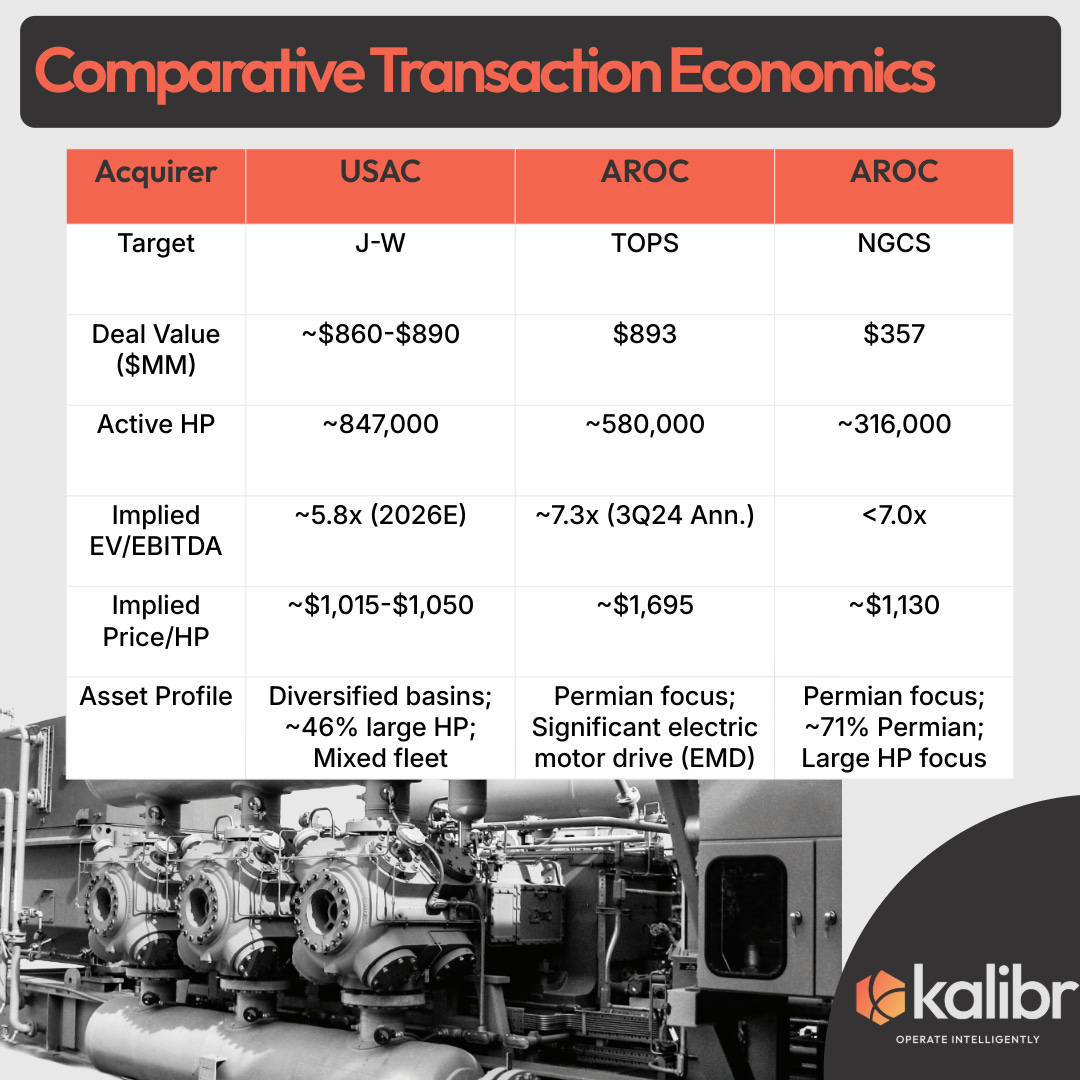 USAC’s acquisition of J-W is a reminder that pricing power cannot stay bottled up in one basin and one product class. The deal clears at roughly 5.8x 2026E EBITDA and about $1,015 to $1,050 per horsepower, a clear discount to Archrock’s recent transactions. TOPS transacted at roughly 7.3x and about $1,695 per horsepower. NGCS cleared below 7.0x and around $1,130 per horsepower. That discount is not just asset quality. It is also geography and mix.