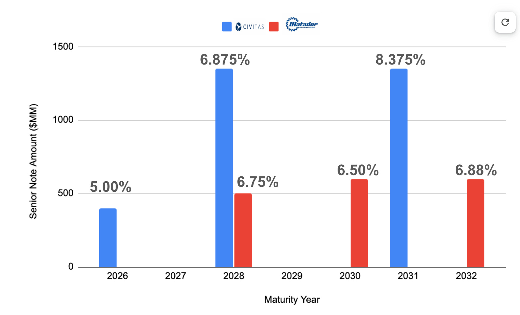 Matador (MTDR) plays a different hand. $2.95B in debt, no material maturities until 2028. A lightly drawn revolver. $1.8B in liquidity. Fitch gave them a sticker and a smile.