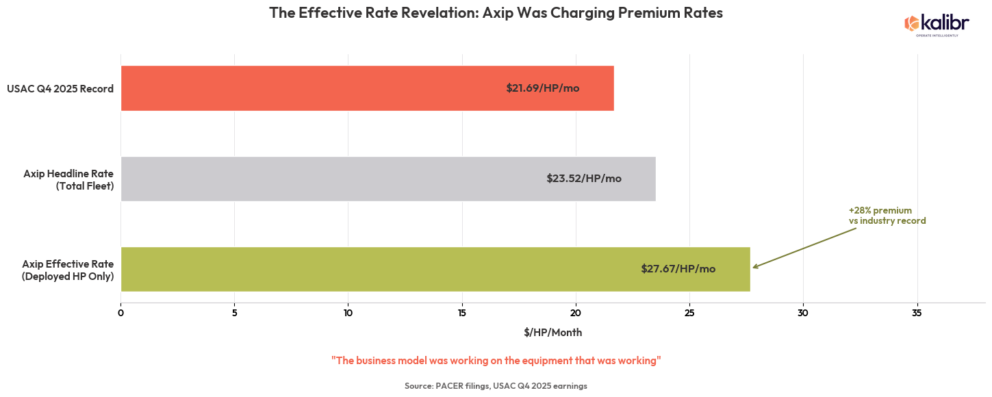 Axip’s pre-stranding revenue ran approximately $92 million annually against a fleet of 326,070 HP, an implied rate of $23.52 per HP per month across the total fleet. But 15% of that fleet was stranded and generating zero revenue. Calculate on deployed horsepower only and the effective rate was $27.67 per HP per month, higher than USAC’s record $21.69. Axip was not losing the rate war. The business model was working on the equipment that was working. What it could not survive was the vacancy.