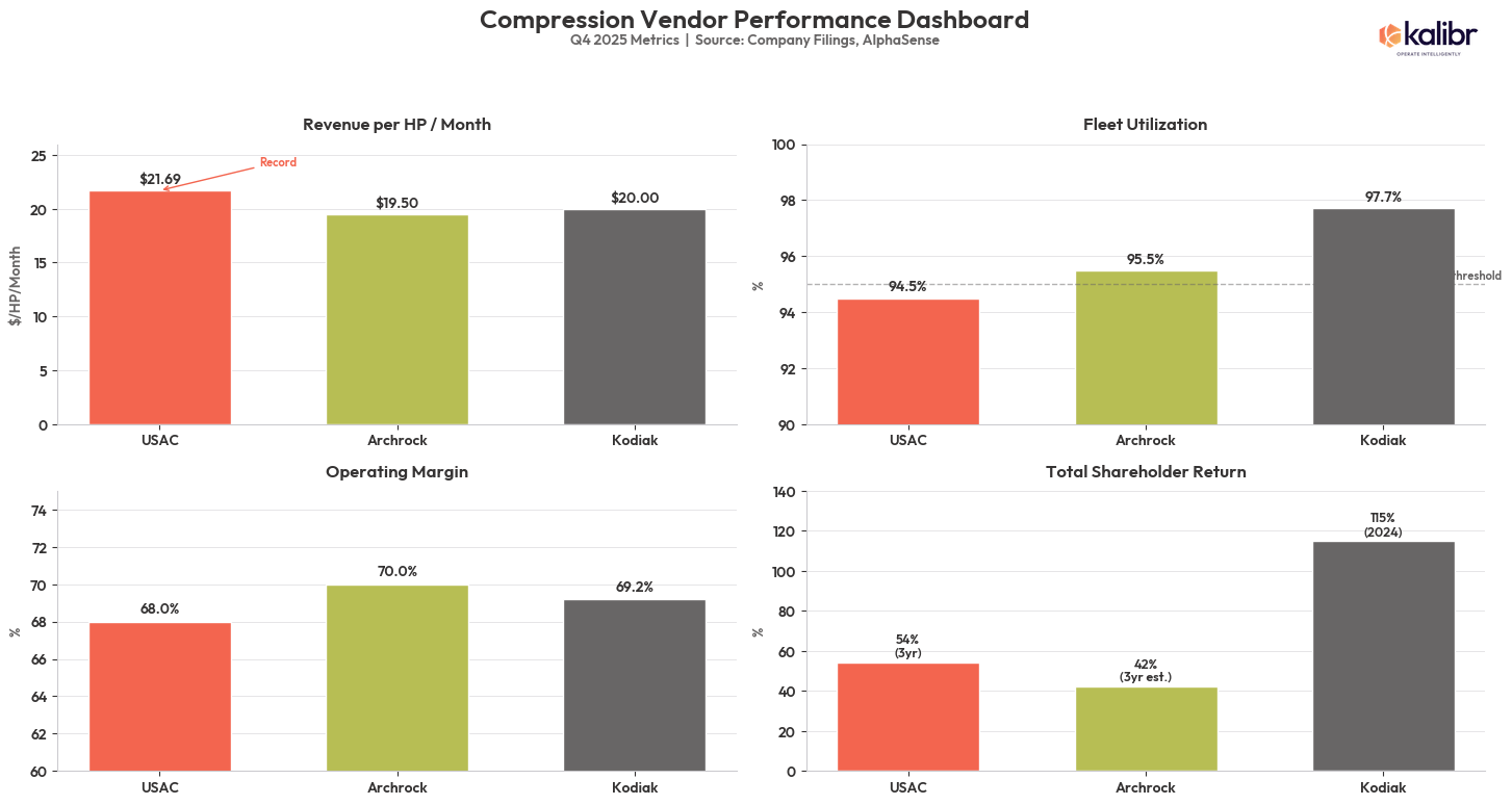 To put that in context your CFO will appreciate: USAC’s three-year total shareholder return of 54% nearly matched the S&P 500 Value index during one of the most aggressive tech bull markets in history. Compression does not have a ChatGPT moment or a Blackwell chip launch. It has a Caterpillar 3608, a multi-year contract, and a customer who cannot turn off the gas lift without killing the well. It turns out that is a durable competitive position.