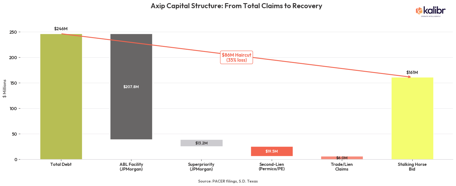 On February 22, 2026, Axip Energy Services filed for Chapter 11 in the Southern District of Texas. Energy Spectrum Capital had acquired the company in September 2022, loaded it with $240.5 million in debt, and watched the thesis fall apart in roughly three years. The stalking horse bid from Service Compression LLC came in at $161 million, 33 cents on the debt dollar.