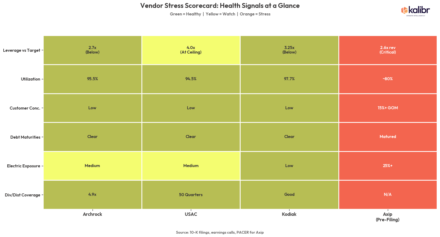 First, utilization is not a performance metric. It is a solvency metric. For a vendor running 4x leverage against contracted equipment cash flows, the difference between 95% and 80% utilization is the difference between distributable cash and covenant breach. The problem is that in the current market, all three majors are running 94 to 98%. The headline number does not tell you much. What matters is primary term exposure: which contracts are rolling, when, and what that does to forward utilization when the aggregate looks healthy. That is where the fragility hides. It is also where the negotiating window opens, if you know where to look. (Kalibr tracks primary term exposure at the vendor level. More on how to use that in a future piece.)