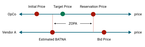 First, we need a basic understanding of negotiation science. Every strategic negotiation starts by quantifying the Best Alternative to Negotiated Agreement, or BATNA. There are two sets of BATNA in any negotiation; my BATNA and the Counterparty BATNA. Both of these can be normalized to a monetary figure, and the difference between these endpoints defines our Zone of Possible Agreement (ZOPA). The ZOPA marks the possible range of outcomes for that negotiation. The ZOPA range is the key driver behind Mainline’s Leverage Utilization calculation.