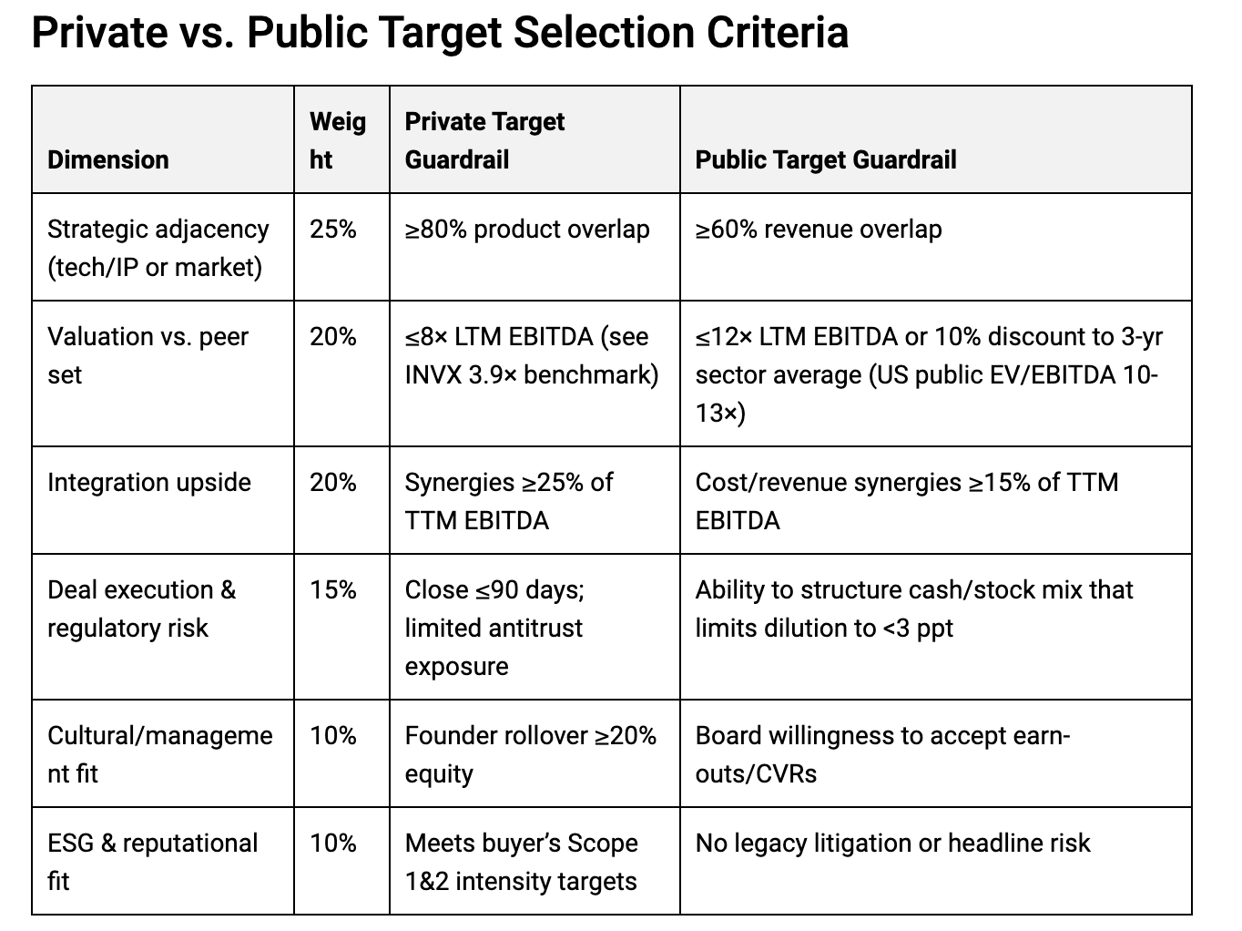 Financial logic. Private tuck-ins trade at 3–6x EBITDA and close quickly. Public platforms print 10–13x and care about optics. The spread is worth four turns if you can show credible synergy timing. Our guardrails keep pro-forma multiples at or below 9x post-synergy, maintain net debt to EBITDA under 3.0x, and cap dilution under 15%. This is not about paying more. It is about paying smart.