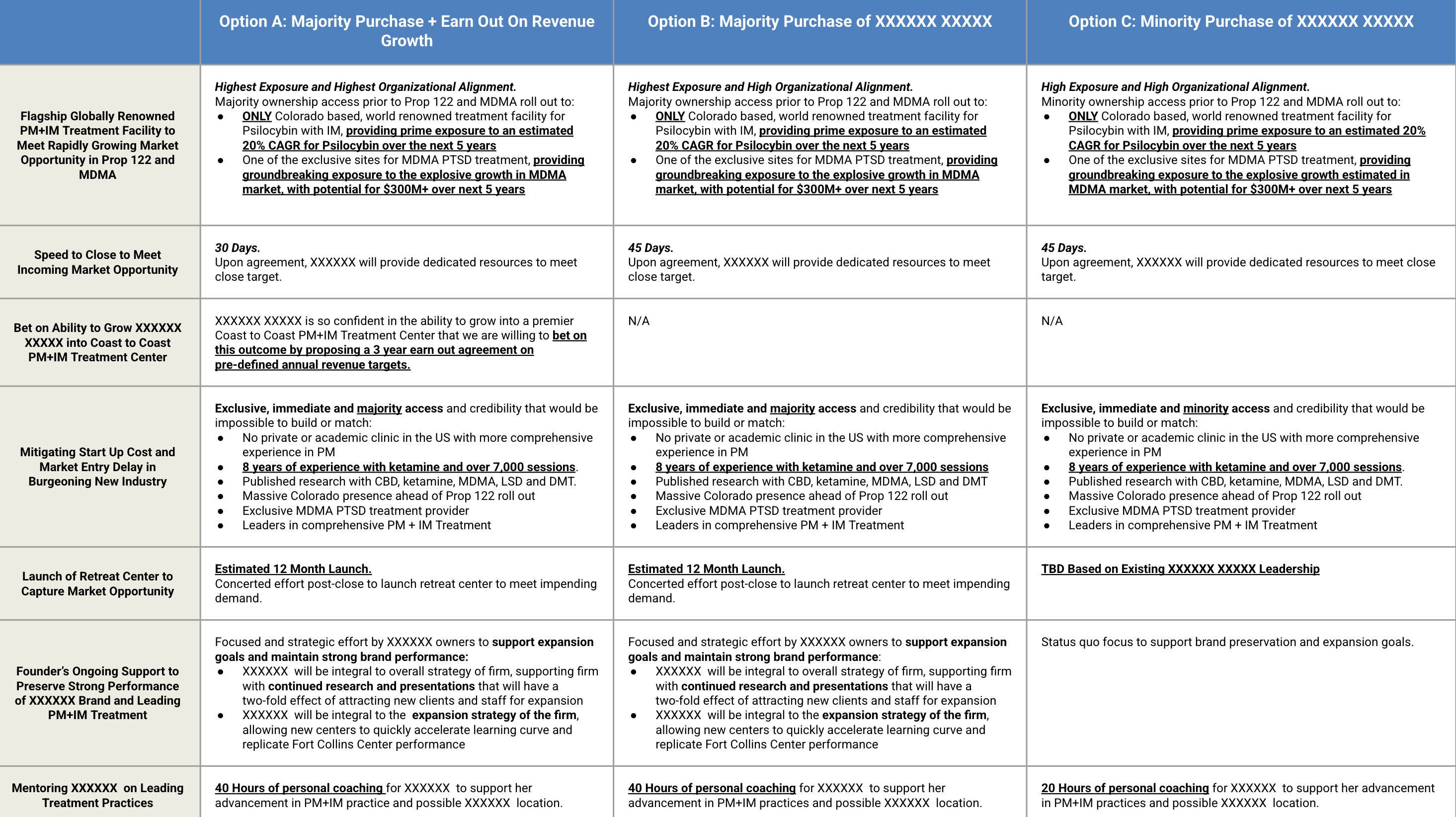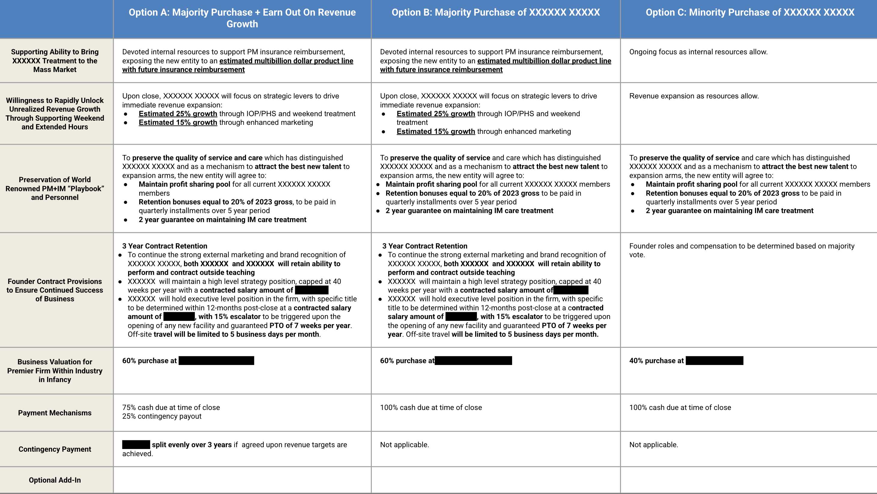 Each option baked in retention architecture, founder role clarity, immediate growth levers, a buyer-side insurance unlock, and a new-market entry plan. We expected two rounds and designed the set so landing on A’s structure at C’s initial headline would still clear our targets.