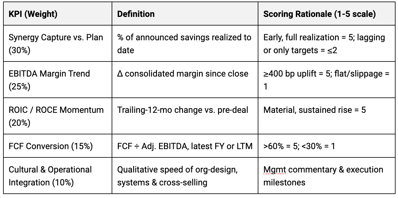 Weights reflect where value actually comes from in consumables roll-ups. Speed and margin drive more than half the score. ROIC governs discipline. Cash confirms it is real. Culture is the canary without letting vibes run the math.