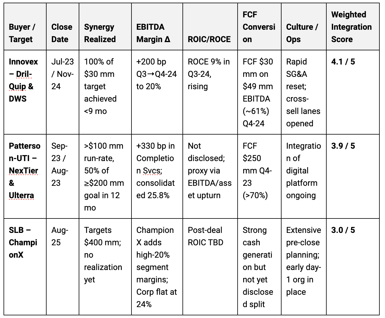 PTEN scores high on margin and scale but realized about half of its ≥$200m synergy run-rate in year one, with less ROIC transparency, so it sits in the high-3s. SLB↔ChampionX is early. Targets are large, realization is not yet visible.