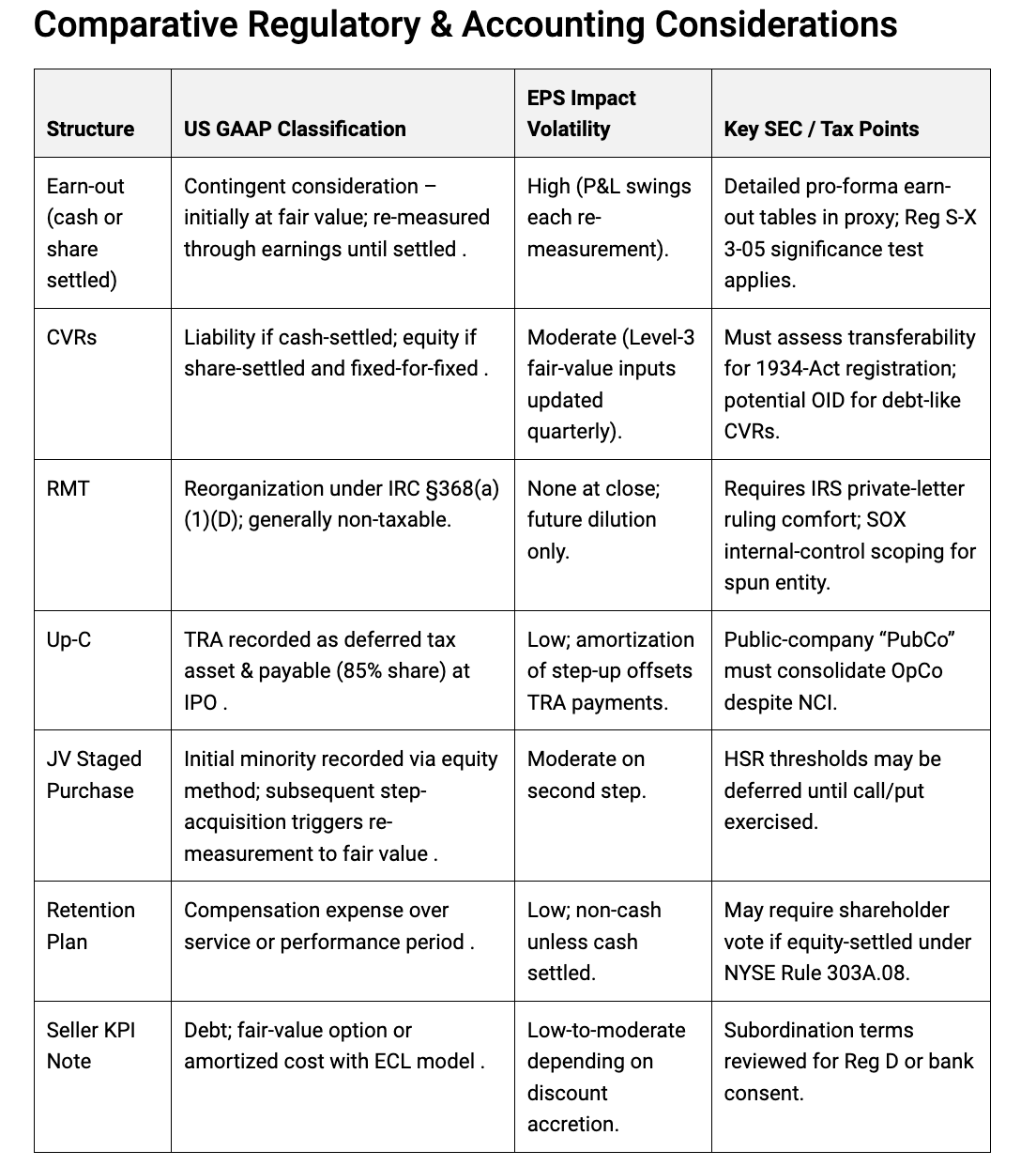 Contingent value rights. Rights that convert to cash or stock only if performance hits. Headline multiple looks conservative. Sellers keep a “kicker.” Accounting remains controlled until milestones become probable.